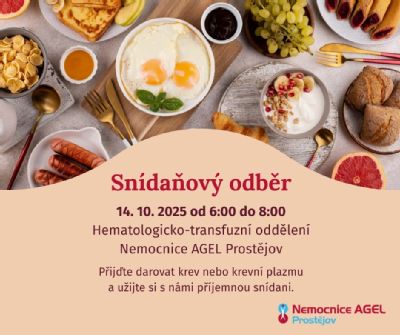 Nemocnice AGEL Prostějov zve všechny pravidelné i nové dárce na tradiční snídaňový odběr, který se uskuteční v úterý 14. října 2025 od 6:00 do 8:00 hodin na Hematologicko-transfuzním oddělení.