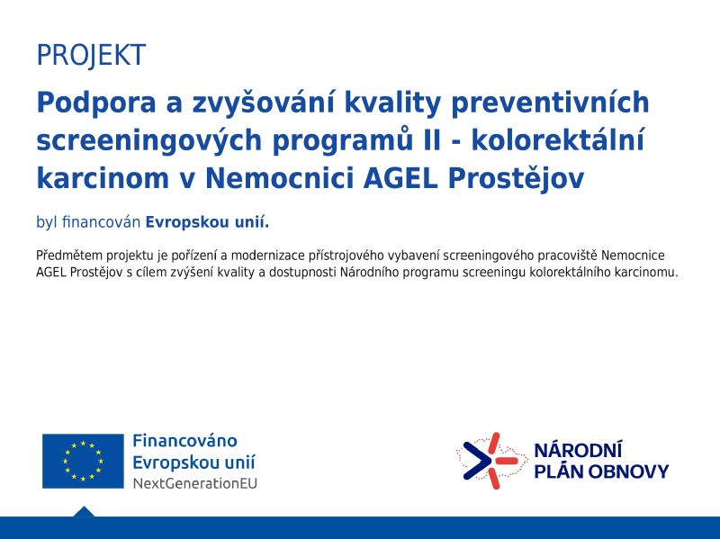 Nemocnice AGEL Prostějov úspěšně dokončila projekt zaměřený na zvýšení kvality a dostupnosti screeningu kolorektálního karcinomu. Projekt s názvem „Podpora a zvyšování kvality preventivních screeningových programů II – kolorektální karcinom v Nemocnici AGEL Prostějov je financován Evropskou unií z Nástroje pro oživení a odolnost prostřednictvím Národního plánu obnovy ČR.