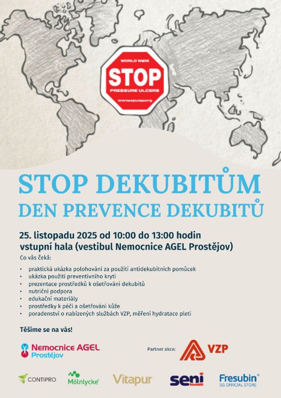 Nemocnice AGEL Prostějov pořádá v úterý 25. listopadu od 10:00 hodin ve vestibulu nemocnice preventivní akci věnovanou prevenci a péči o dekubity. Proleženiny, odborně nazývané dekubity, představují závažný zdravotní problém vznikající v důsledku dlouhodobého tlaku na kůži a podkoží, nejčastěji u pacientů s omezenou pohyblivostí. Správná prevence přitom může jejich vzniku účinně předejít. Akce nabídne praktické ukázky správného polohování s využitím antidekubitních pomůcek a také ukázku použití preventivního krytí. Návštěvníci se seznámí s moderními prostředky určenými k ošetřování dekubitů a získají informace o nutriční podpoře při prevenci proleženin. Součástí programu budou také edukační materiály a prezentace prostředků pro péči a ochranu kůže. Akce se zúčastní i zástupci Všeobecné zdravotní pojišťovny, kteří poskytnou zájemcům poradenství ohledně nabízených služeb a provedou měření hydratace pleti. Akce je určena široké veřejnosti, pacientům i jejich blízkým, kteří se chtějí dozvědět více o správné prevenci i následné péči při vzniku dekubitů. Nemocnice AGEL Prostějov zve všechny zájemce k účasti a věří, že získané informace přispějí ke zvýšení povědomí o dekubitech.